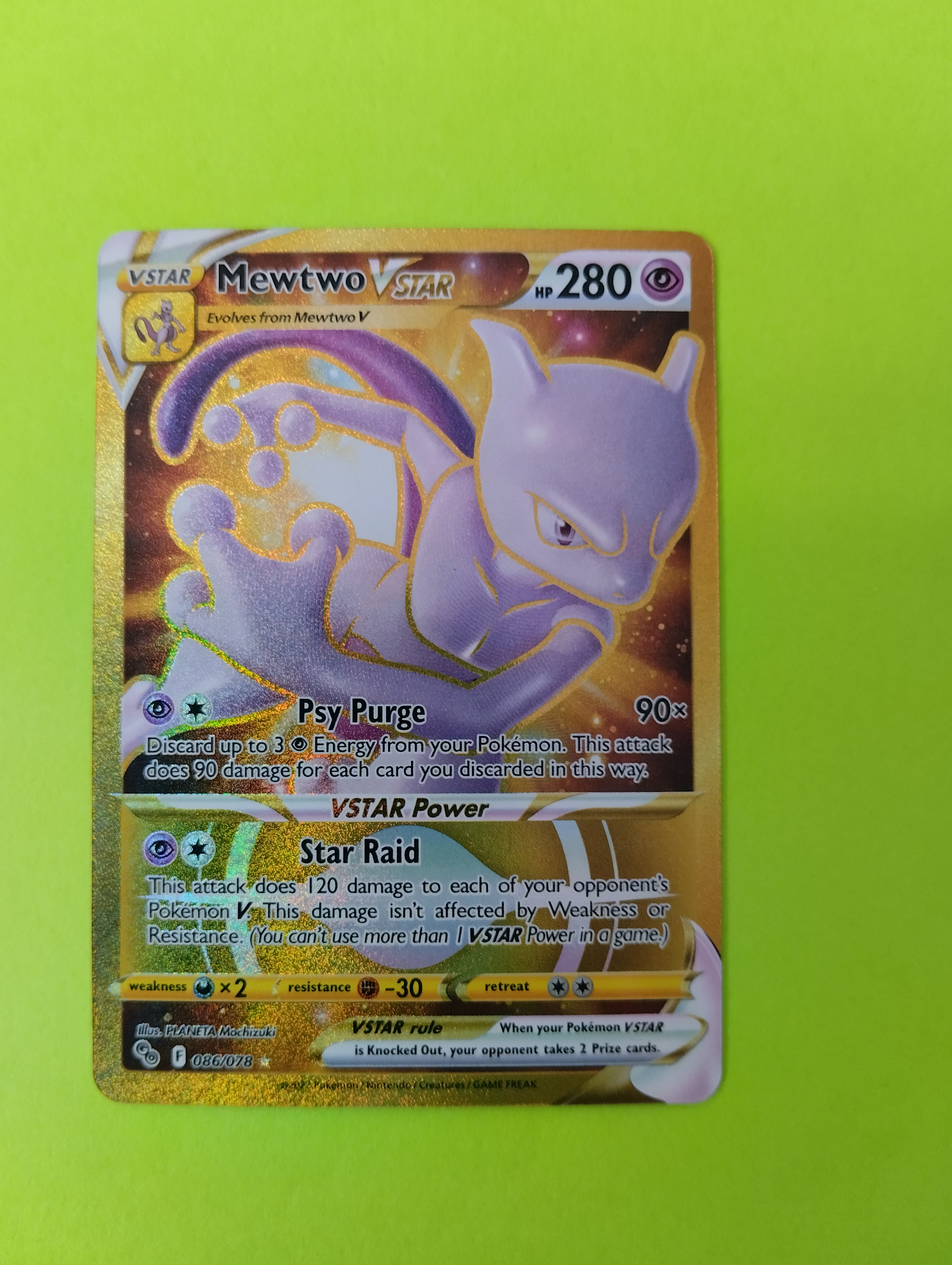 Mewtwo VSTAR (Gold) je ve velmi pěkném stavu, bez viditelných škrábanců nebo poškození. Karta byla od rozbalení pečlivě uchovávaná v obalu. :)
